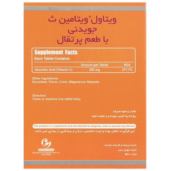 توصیه میشود، روزانه یک عدد قرص ویتامین سی ویتاول به صورت جویدنی یا بلعیده مصرف گردد. این مکمل به راحتی به شکل جویدنی و حتی بلعیدنی قابل استفاده است و به حفظ سطح مناسب ویتامین C در بدن کمک میکند.